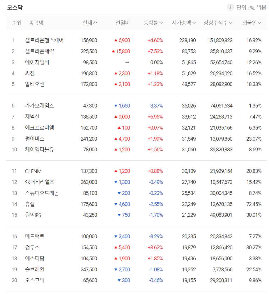 시가총액 상위 종목 중 카카오 게임즈(-3.37%)만 하락했고 셀트리온헬스케어(+4.60%), 셀트리온제약(+7.53%), 씨젠(+1.18%), 알테오젠(+1.23%) 제넥신(+6.95%) 등은 올랐습니다.