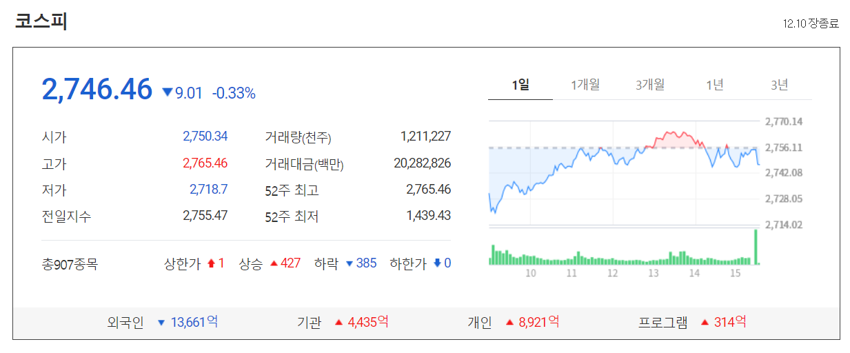 오늘 코스피는 어제보다 9.01포인트(0.33%) 내린 2746.46에 장을 마감했습니다.