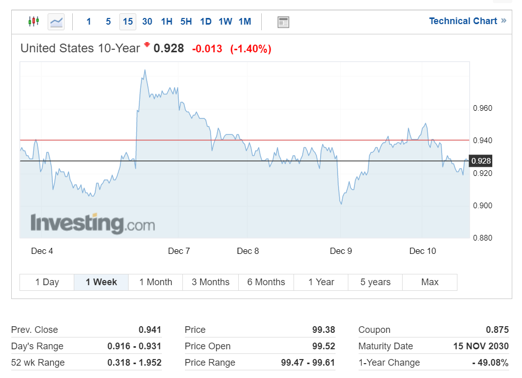 미국 10년 만기 국채 수익률은 점차 하락하면서 현재 0.928% 기록 중입니다.