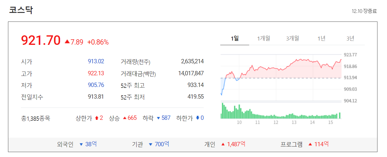 오늘 코스닥은 어제보다 7.89포인트(0.86%) 오른 921.70에 장을 마쳤습니다.