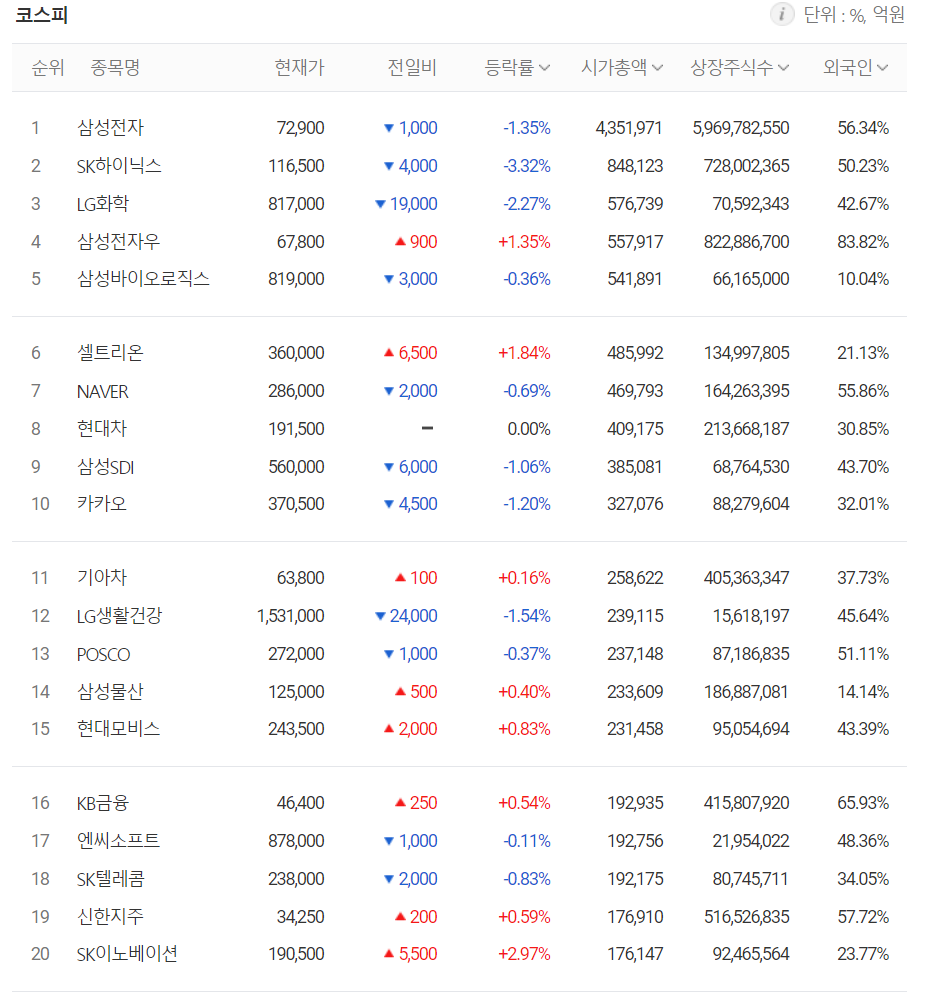 시가총액 상위 10개 종목 중에서는 삼성전자우(+1.35%), 셀트리온(+1.84%)만 상승했고 삼성전자(-1.35%), SK하이닉스(-3.32%), LG화학(-2.27%), 삼성바이오로직스(-0.36%), NAVER(-0.69%), 삼성SDI(-1.06%), 카카오(-1.20%) 등 대부분의 시총 상위 종목은 하락했습니다.