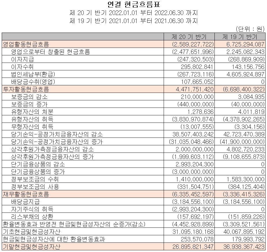 지난 상반기 영업활동 현금흐름에서는 당기순손실의 발생으로 26억 원의 현금이 유출되었으며, 투자활동에서는 공정가치측정 금융자산의 감소로 45억 원이 유입되었습니다. 재무활동에서는 당기 부채를 상환하고, 자기 주식의 취득과 배당금의 지급으로 63억 원이 유출되었습니다. 2022년 상반기 말 기준 당사가 확보하고 있는 현금은 269억 원으로 전년 동기 대비 27.2% 감소했습니다.