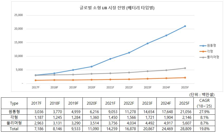 상기 보고서처럼 소형 전지 시장은 각형과 폴리머형의 완만한 성장과 달리 원통형 전지를 중심으로 급성장 할것으로 전망됩니다.