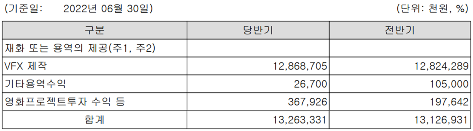 당사는 영화, 드라마, 광고, 뉴미디어 등 모든 영상 전반에 대한 VFX(Visual Effects, 시각효과)의 제공, 콘텐츠 기획, 제작 및 콘텐츠 사업의 투자를 주요 사업으로 영위하고 있습니다. 특히 당사는 영화, 드라마의 음향 제작 및 음향 설계 컨설팅 사업 등을 진행하는 (주)라이브톤과 종합 영상 콘텐츠 제작 사업을 영위하는 (주)덱스터픽처스, 광고 제작 및 대행업의 (주)크레마 등의 종속회사와 시너지를 통해 당사는 영상 관련 콘텐츠 기획, 촬영 및 제작, VFX, DI, Sound 등 전후반 작업에 이르는 모든 라인업을 구축한 국내 유일의 종합 영상 스튜디오입니다.