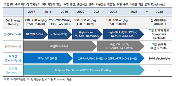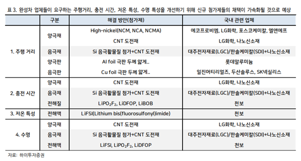하이투자증권의 분석에 의하면 배터리 성능을 향상할 수 있는 3가지 핵심 소재는 다음과 같습니다.