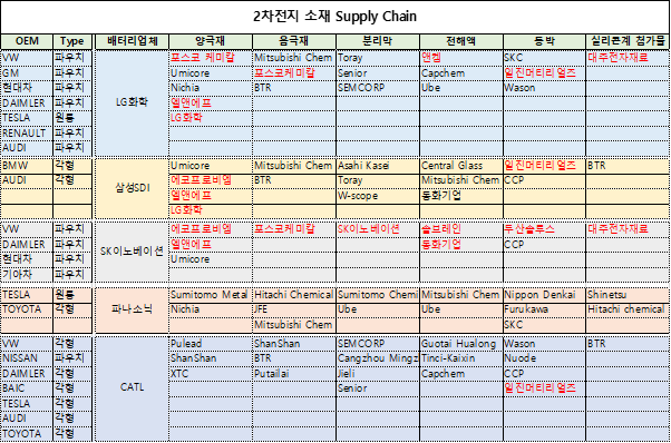 아래 표는 2차전지 소재 관련 국내외 업체들에 대한 공급망을 정리한 표입니다.