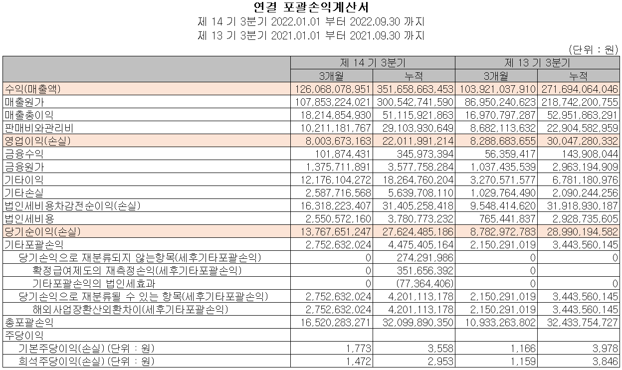 2022년 3분기 매출액은 1,261억 원으로 전년 동기 대비 21.3% 증가했고, 3분기 누적 매출액은 3,517억 원으로 29.4% 증가했습니다. 영업이익은 3분기에는 80억 원으로 3.4% 감소했으며, 누적 기준으로는 220억 원으로 26.7% 감소한 실적을 거두었습니다. 전반적으로 2차 전지 수요가 증가하면서 매출은 성장했으나 인건비, 전력비, 물류비 등 비용 부담이 증가하면서 수익성은 감소했습니다.