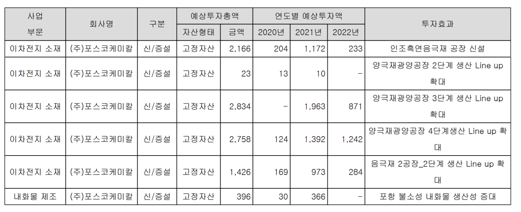 신규 투자 계획 6건 중 이차전지 소재 관련이 5건으로 2022년까지 9,257억 원의 투자를 한다고 밝혔습니다.
