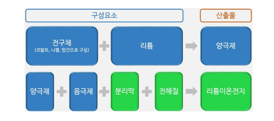 리튬이온 배터리(2차전지)는 크게 양극재, 음극재, 분리막 전해액의 네 가지로 구성되어 있습니다.