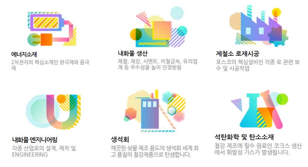 | 주요 품목 | 종합 내화물, 로재시공 및 보수, 석회, 석탄화학 및 탄소소재, 2차전지 음극재 및 양극재 |