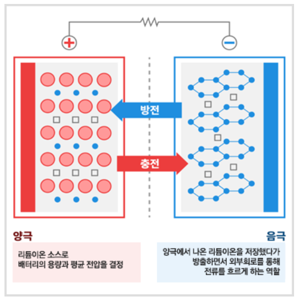 음극재는 양극에서 나온 리튬을 저장했다가 방출하면서 전기를 발생시키는 역할을 합니다.