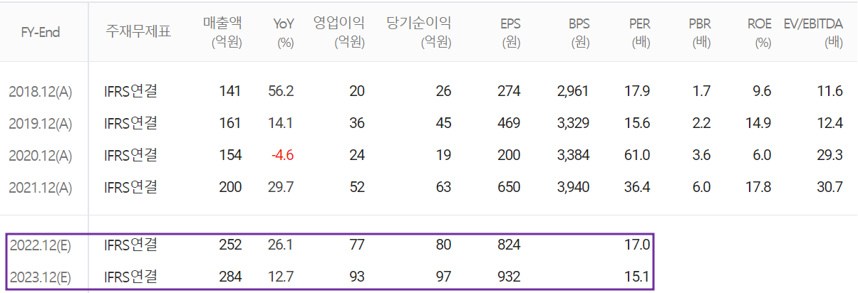 2022년 예상 실적은 매출액 252억 원으로 2021년 대비 26.1% 증가하고, 영업이익은 77억 원으로 48% 증가할 것으로 추정했습니다. 2023년에는 매출액 284억 원으로 12.7% 증가하고, 영업이익은 93억 원으로 21% 증가할 것으로 전망했습니다. 자율주행 적용을 위한 연구 개발로 당사의 라이선스 수요가 증가하고 있으며, 미중 무역전쟁에 따른 중국향 수요 또한 꾸준히 증가하면서 당분간 꾸준한 성장을 예상하고 있습니다.