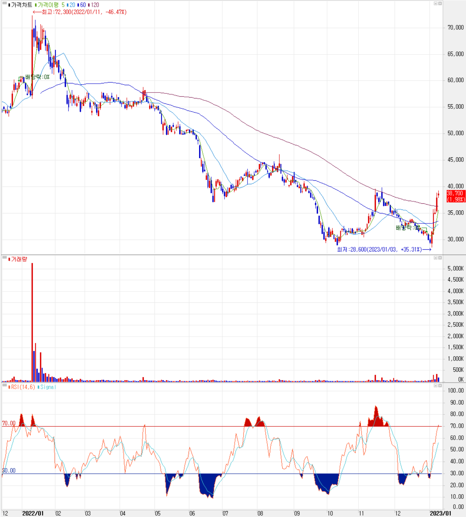 시장 불확실성과 전방 산업의 수요 둔화로 지난해 지속적인 하락세를 보이던 주가는 1월 들어서면서 중국 리오프닝 및 자동차 전장향 수요 증가 전망에 급등세를 보이고 있습니다. 수급에서는 기관의 5 거래일 연속 순매수로 최근 상승세를 이끌고 있으며, 개인은 매도로 대응하고 있습니다. 예상 실적, 투자 포인트 및 차트 소견을 종합한 개인적인 목표주가는 45,000원으로 설정하였습니다.