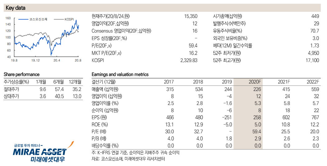 코스모신소재가 최근 포스코케미칼 양극재 공급 소식에 거침없이 오르고 있습니다. 지난주 기업분석을 준비하면서 매수 타이밍을 보고 있다가 놓쳤는데 그사이 올라갔네요, 이평선 정배열 상태로 아직도 추가 여력은 있어 보이지만 이미 개인적인 단기 목표가 근처에 가버려서 고민 중입니다. 성장주는 현재의 데이터나 차트보다는 기업의 능력을 기반으로 한 미래의 가능성인데, 그럼에도 불구하고 쉽지 않네요.