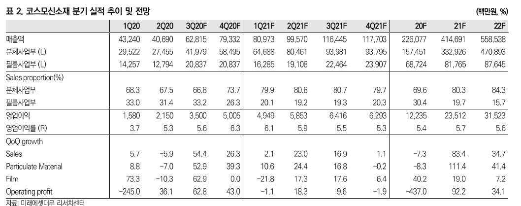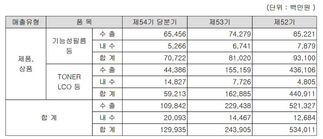 지난 3분기 기준 기능성필름의 매출이 전체의 54.4%인 707억 원이고, 토너와 양극활물질에 대한 매출이 45.5%를 차지하고 있습니다. 토너와 이차전지 매출을 분리시켰으면 좋을 뻔했네요.