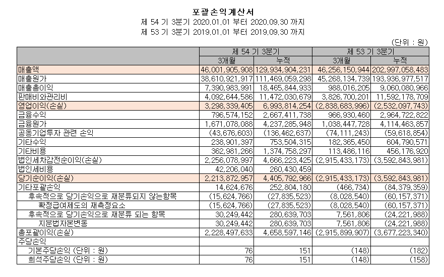 지난 3분기 당사의 매출 실적은 460억 원 영업이익은 32억 9천만 원으로 전년 동기 대비 매출은 -0.5%로 소폭 감소했으나 영업이익은 28억 손실에서 32.9억 원 이익으로 전환됐습니다.