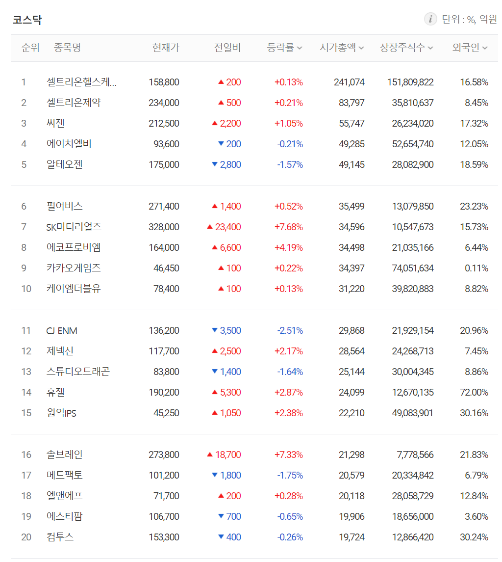 코스닥에서 외국인 순매수 상위 종목은 셀트리온헬스케어, 셀트리온제약, 천보, 씨젠, 에코프로비엠 등이었고 CJ ENM, 메디톡스, 디바이스이엔지, 코리아센터, 네패스 등을 순매도했습니다.
