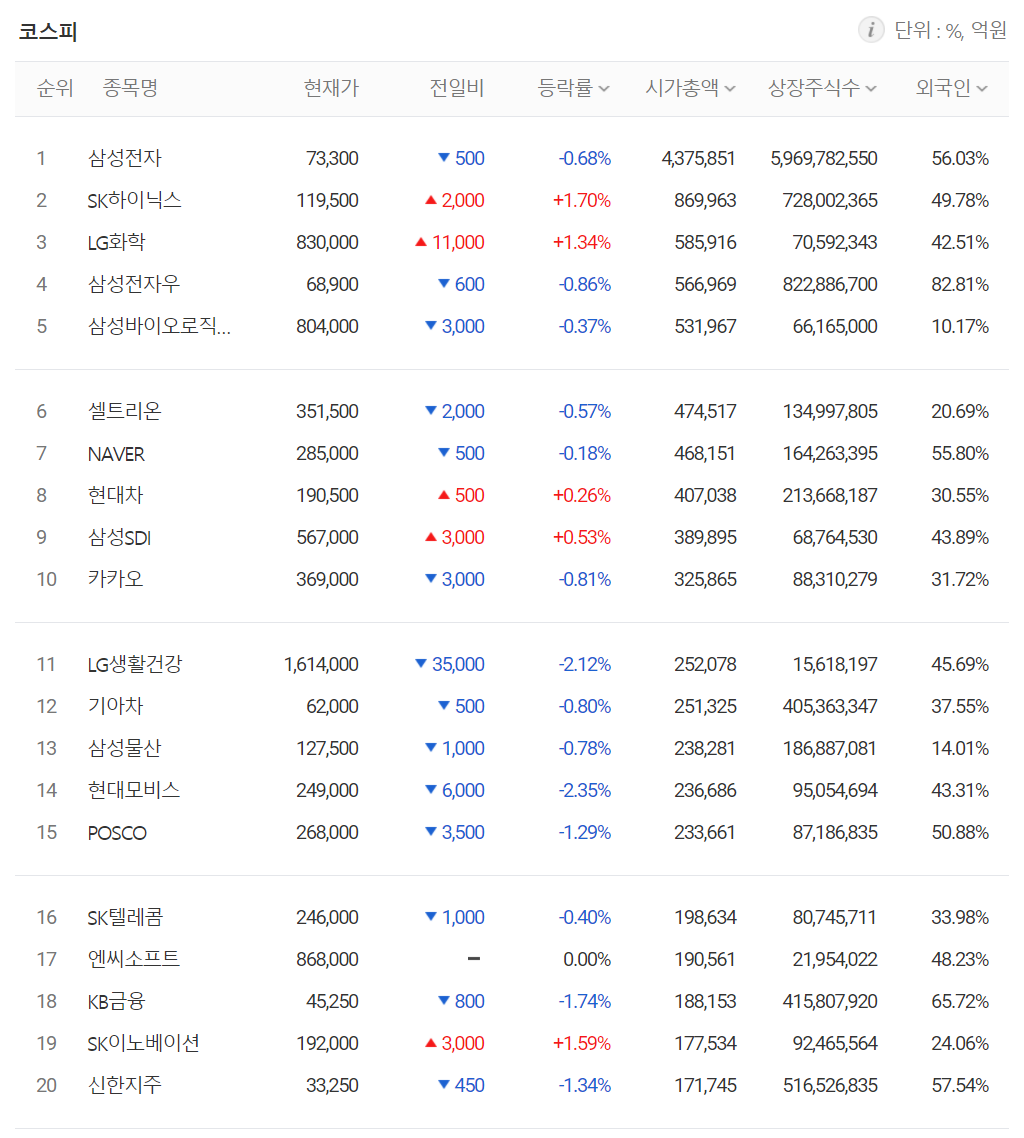 오늘 시가총액 상위 종목 중에는 SK하이닉스(+1.70%), LG화학(+1.34%), 현대차(+0.26%), 삼성SDI(+0.53%) 등이 오른 반면 삼성전자(-0.68%), 삼성바이오로직스(-0.37%), 셀트리온(-0.57%), NAVER(-0.18%), 카카오(-0.81%) 등은 내렸습니다.