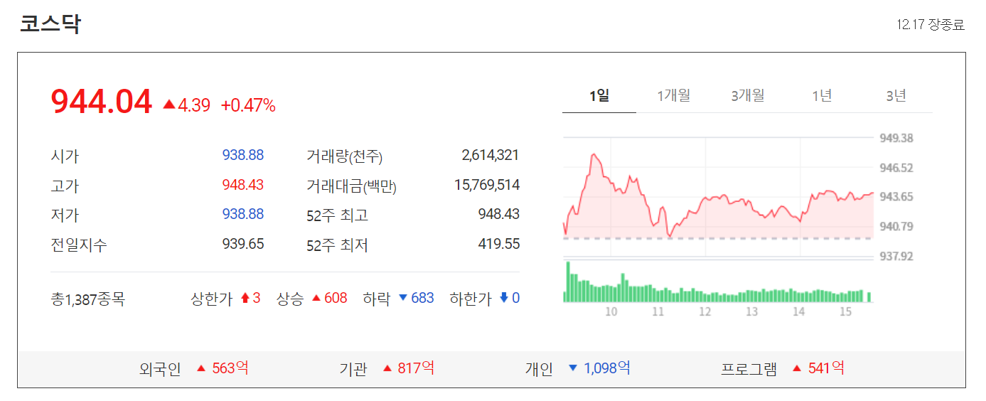 오늘 코스닥은 어제보다 4.39포인트(0.47%) 오른 944.04에 장을 마감했습니다.