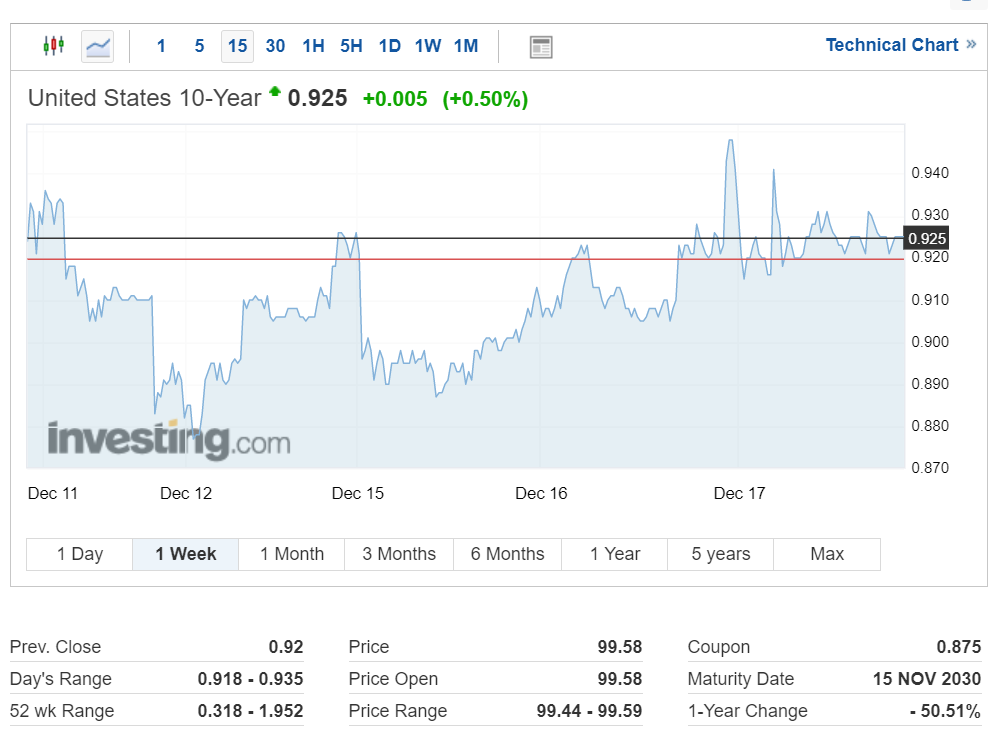 미국 10년 만기 국채 수익률은 현재 0.925%를 기록하면서 상승 중입니다.