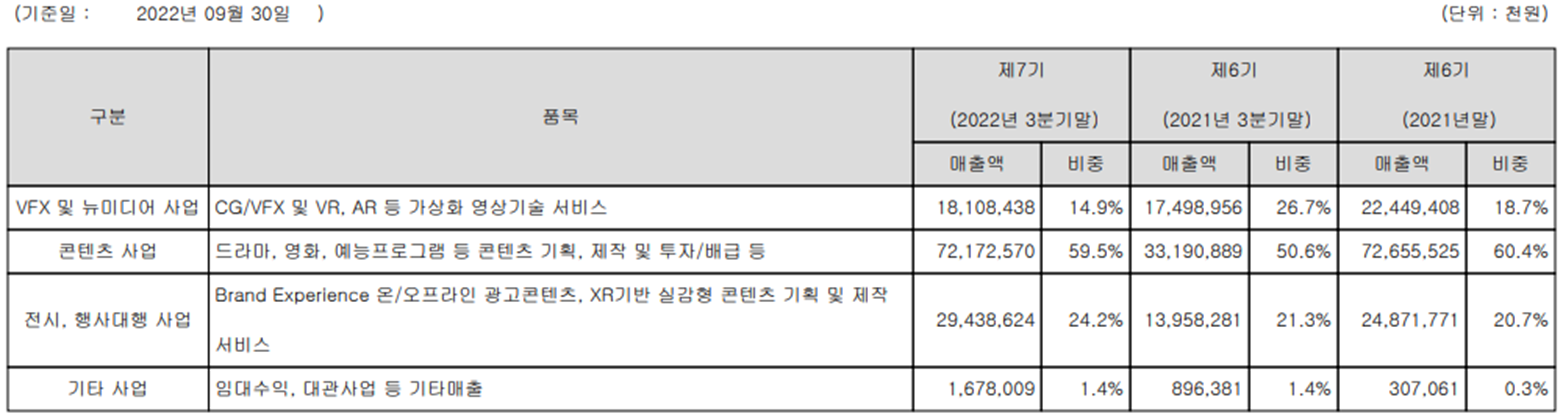 당사는 CG와 VFX 기술을 바탕으로 영화, 드라마, 뉴미디어, 공연 및 전시에 이르기까지 온, 오프라인 콘텐츠 기획, 제작 서비스를 종합적으로 제공하는 기업입니다. 특히 '승리호', '무한심도', '뮬란', '마녀' 등 국내외 대규모 프로젝트를 성공시켰으며, 최근에는 넷플릭스 8부작 '블랙의 신부'가 방영되기 시작하였고, 시즌에서도 드라마 '신병'이 론칭될 예정에 있습니다. 또한 드라마 제작사인 (주)래몽래인, 전시 광고 전문 기업인 ANP커뮤니케이션즈, 예능/드라마 제작 기업인 (주)이미지나인컴즈 등을 잇달아 인수하면서 영화뿐만 아니라, 드라마, 예능, 공연, 광고 및 뉴미디어 등을 망라하는 다양한 영상 콘텐츠를 공급하는 종합 미디어 콘텐츠 제작사입니다. 지난 3분기 실적에서 VFX 및 뉴미디어 부문의 매출액은 181억 원으로 전체 매출의 14.9%를 차지하였으며, 콘텐츠 부문은 722억 원으로 59.5%, 전시 및 행사 대행 부문에서는 294억 원으로 24.2%의 매출 비중을 기록했습니다. 한편 전사부문 실적에서 수출은 70억 원으로 5.8%, 내수는 1,144억 원으로 94.2%의 비중을 나타냈습니다.