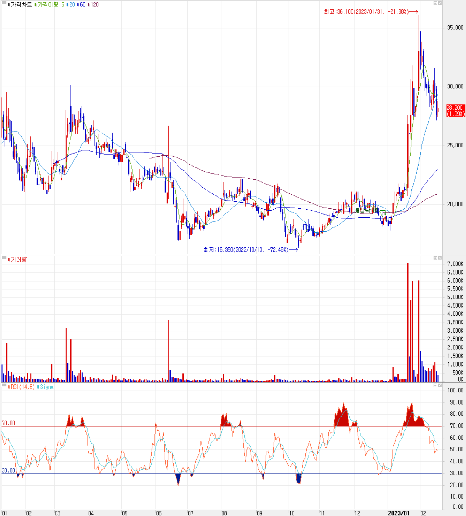 지난 1월 삼성전자 등 대기업이 미래먹거리로 로봇산업에 투자한다는 소식과 마이크로소프트의 챗GPT 투자 소식이 전해지면서, 로봇주와 AI 관련 종목으로 엮인 당사의 주가도 급등세를 보이면서 한 때 36,100원까지 올랐다가 최근에는 2만 원대 후반에서 거래되고 있습니다. 목표주가는 최근 급등에 따른 부담으로 당분간 차트를 모니터링하면서 진입시기를 타진할 예정입니다. 향후 중장기 주가의 방향은 종목 호재 외에도 LG전자를 중심으로 한 공장 자동화에 로보스타가 얼마나 공급하는지에 따라 결정될 것으로 보입니다.