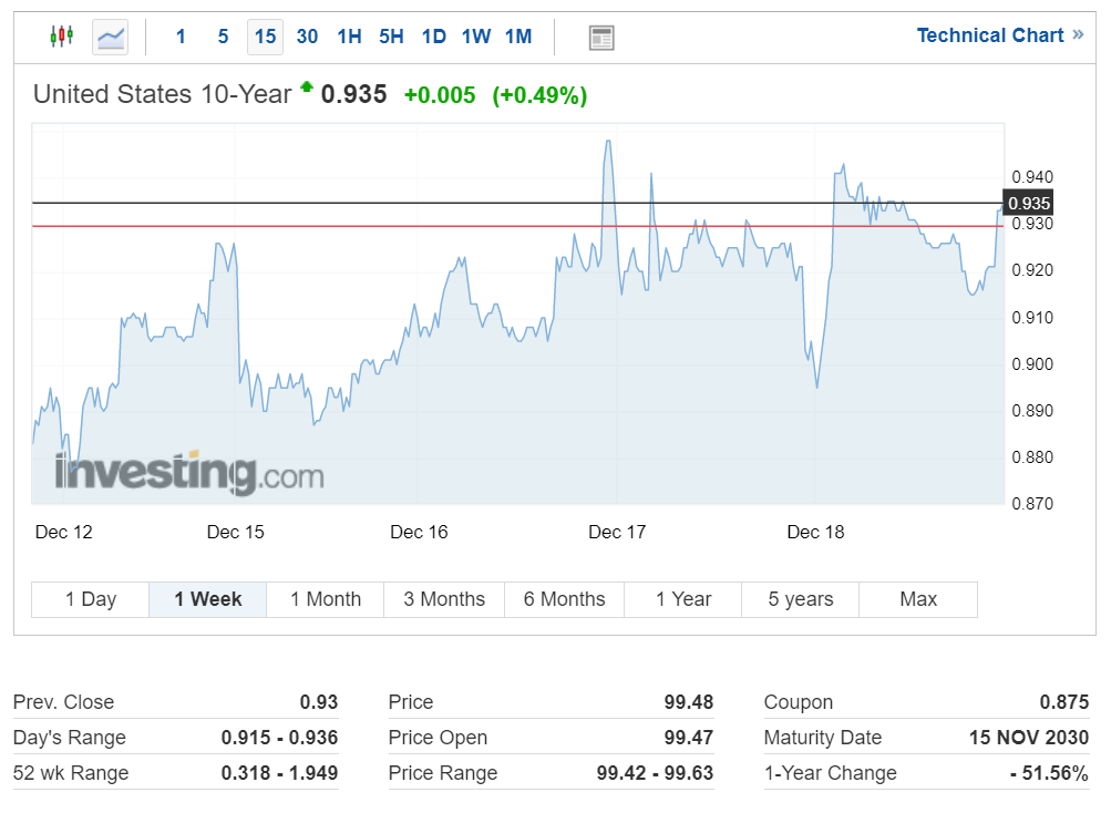 미국 10년 만기 국채 수익률은 현재 0.935%를 기록 중입니다.