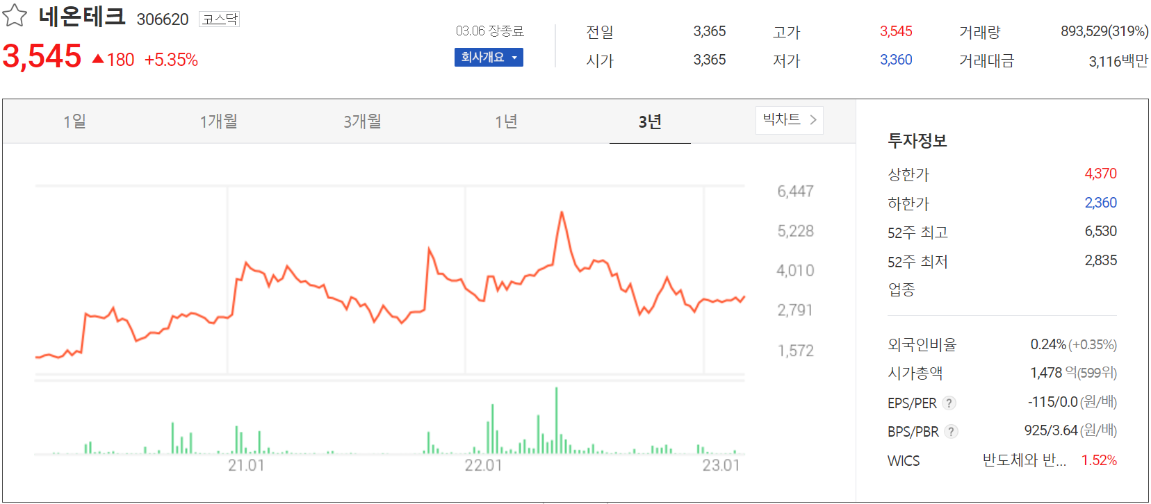 3월 6일 장 종료 기준 당사의 주가는 전 거래일보다 5.35% 오른 3,545원에 거래를 마감했습니다. 외국인 비중은 0.24%이며, 시가총액 1,478억 원으로 코스닥 시총 기준 599위 종목입니다.