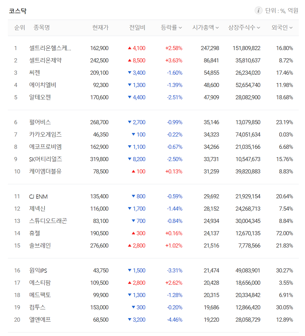 코스닥 시가총액 상위 종목 중에서는 대장주인 셀트리온헬스케어(+2.58%), 셀트리온제약(+3.63%)과 케이엠더블유(+0.13%) 등이 올랐습니다. 반면 씨젠(-1.60%), 에이치엘비(-1.39%), 알테오젠(-2.51%) 등은 하락했습니다.