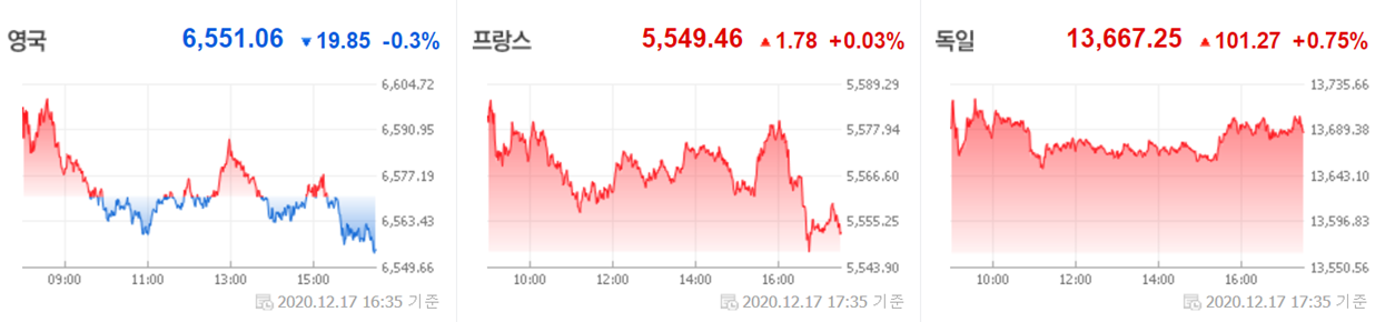 어젯밤 유럽 주요국의 증시는 미국 추가 부양책의 기대감으로 모두 상승 출발했으나 영국과 EU의 무역합의를 기다리면서 나라별로 엇갈리는 모습이었습니다.