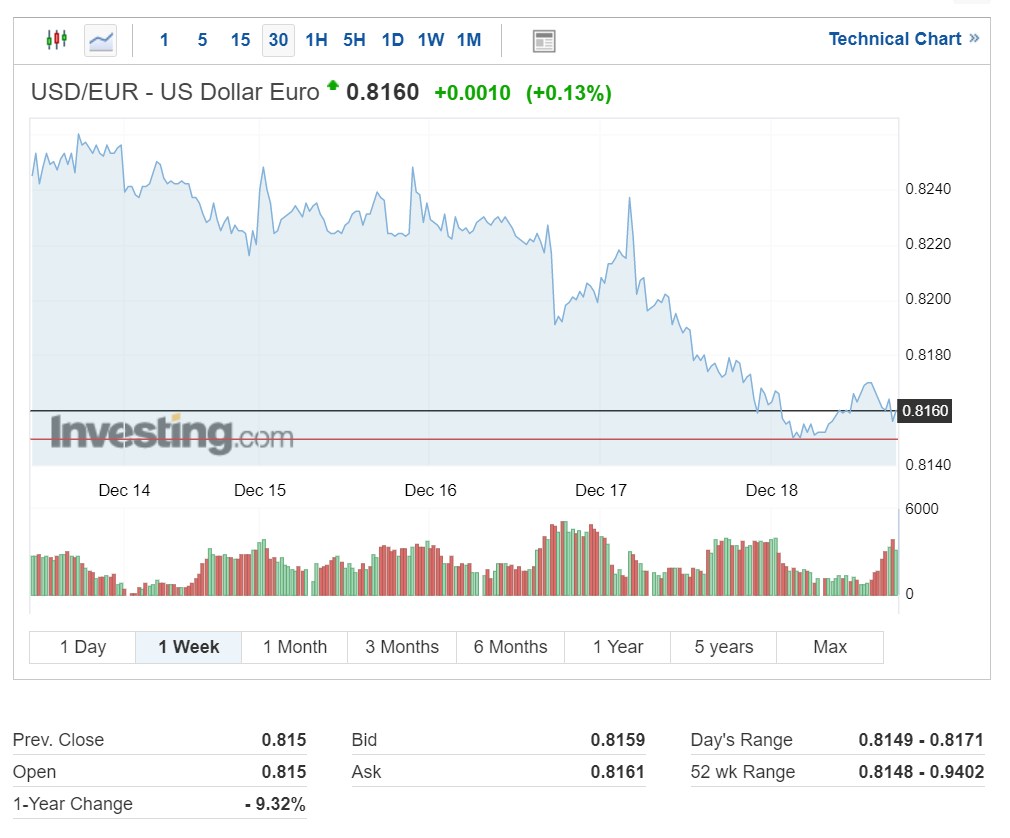 현재 달러 대비 유로 환율은 하락하면서 1달러당 0.8160유로를 기록 중입니다.