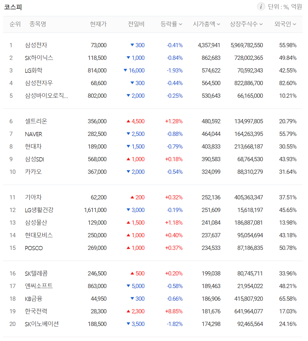 시가총액 상위 10개 종목에서는 셀트리온(+1.28%), 삼성SDI*+0.18%)가 오른 반면 삼성전자(-0.41%), SK하이닉스(-0.84%), LG화학(-1.93%), 삼성바이오로직스(-0.25%0 등은 하락했습니다.