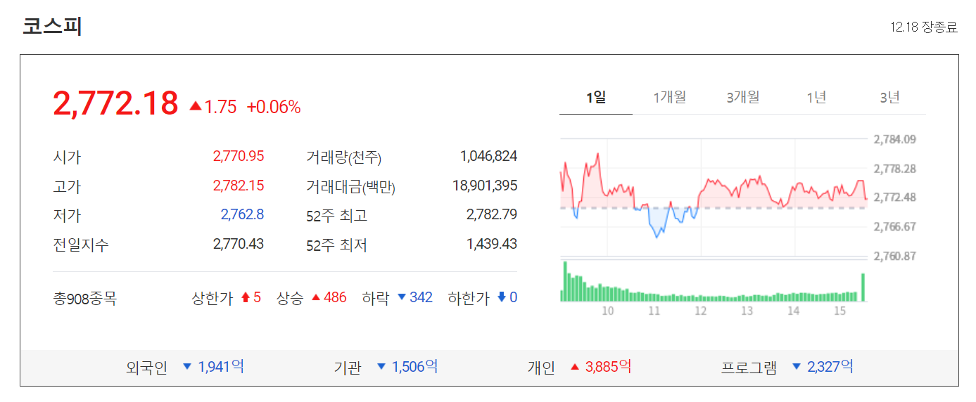 오늘 코스피는 어제보다 1.75포인트(0.06%) 오른 2772.18에 거래를 마감했습니다.