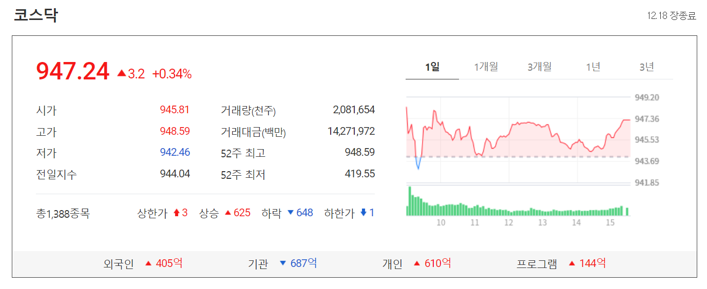 오늘 코스닥은 어제보다 3.2포인트(0.34%) 오른 947.24에 거래를 마쳤습니다.