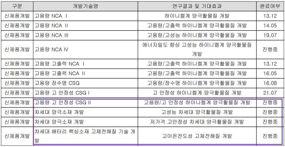 당사 및 종속회사는 지난해 매출액의 0.95%인 509억 원의 비용을 투자하면서 안정성을 기반으로 한 고성능 양극재와 고체 전해질의 연구 개발을 수행하고 있습니다.