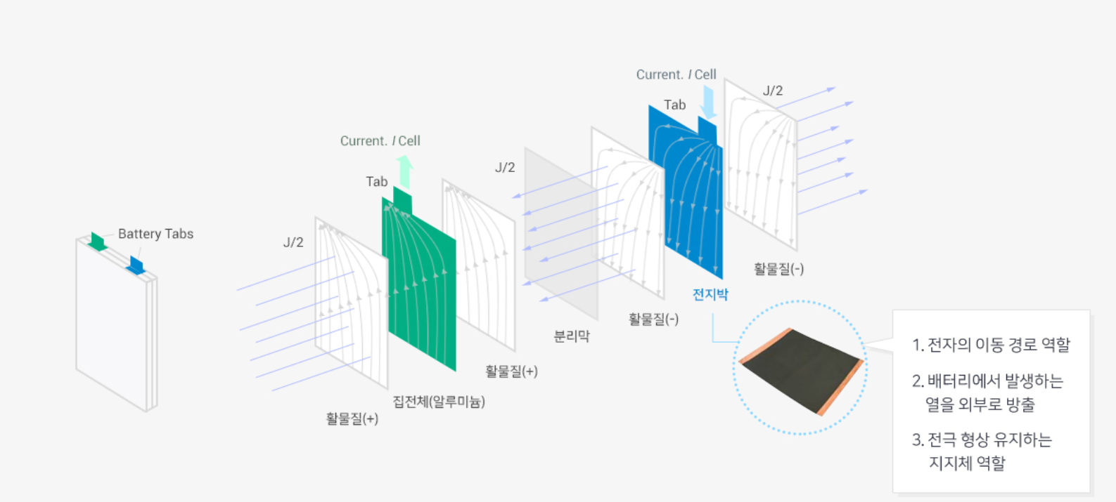 상기 그럼 처럼 전지박은 2차전지의 음극 활물질 사이에 장착되며, 전자의 이동 경로 역할을 함은 물론 배터리에서 발생하는 열을 외부로 방출하는 역할을 합니다.