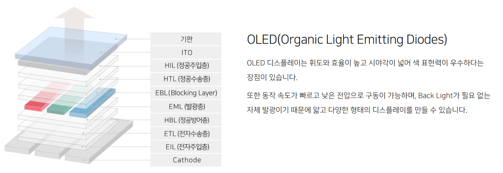 당사는 OLED의 고효율/저전압/장수명 핵심 기술 및 특허를 보유하고 있으며 스마트폰, TV 및 차량용 디스플레이 등 다양한 디스플레이 분야에 사용되고 있습니다.