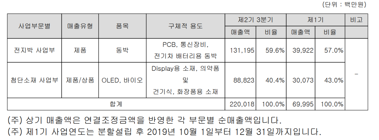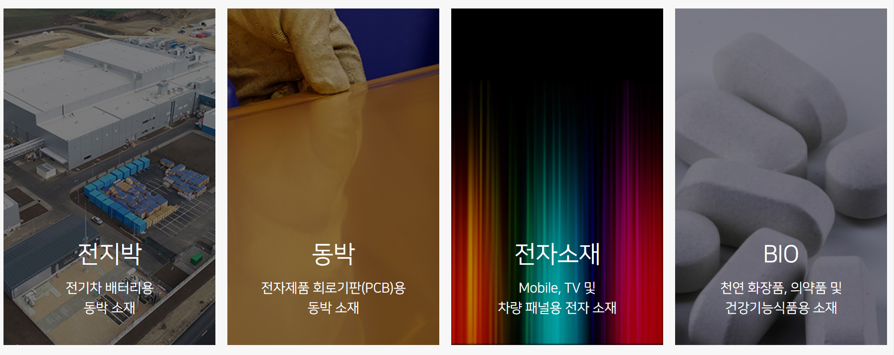 당사의 주요 제품에는 전기차 배터리(2차전지)용 전지박, 전자제품 회로기판인 PCB용 동박, Mobile, TV 및 차량 패널용 전자소재 그리고 천연화장품과 의약품 등의 소재를 제조하는 바이오 사업 등 크게 네 가지 분야의 사업을 영위하고 있습니다.