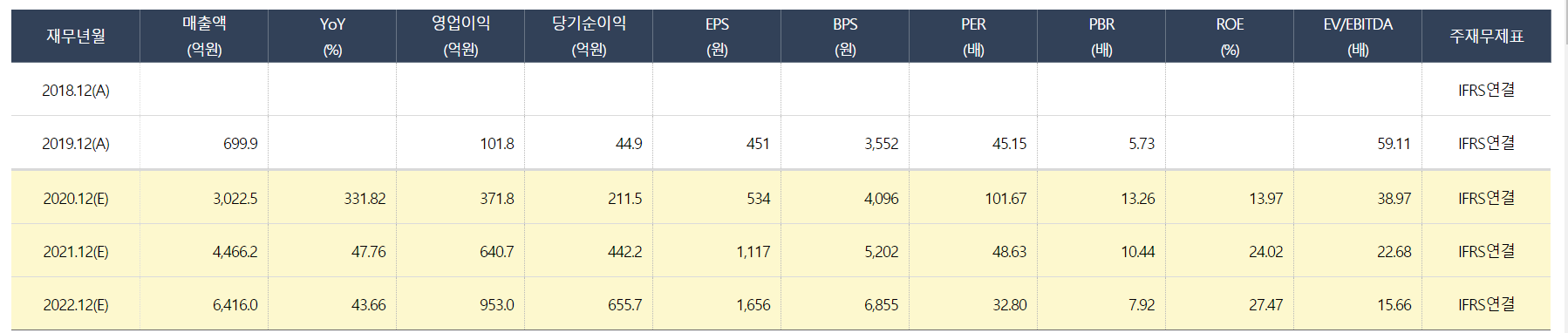올해 매출은 3022.5억 원, 2021년 4466.2억 원(+47.8%), 2022년 6416억 원(+43.6%)으로 매년 40% 이상 고성장이 추정됩니다. 이에 따라 PER도 2021년에는 48.63배, 2022년에는 32.80배로 낮아질 전망입니다.