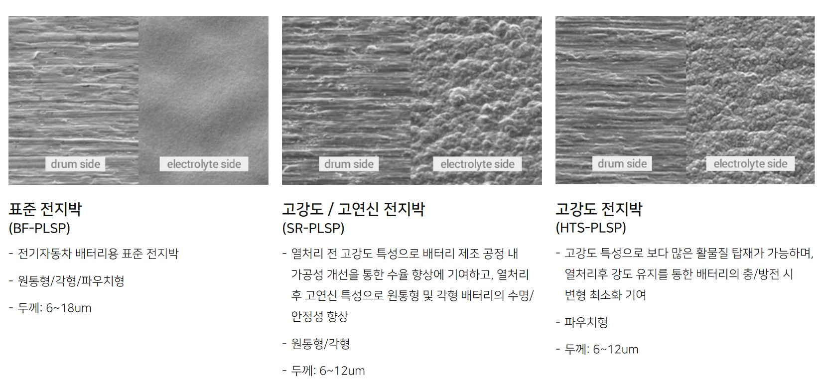 2차전지의 셀 타입은 현재 원통형, 각형, 파우치형 등 3가지가 있는데 당사는 셀의 형태에 따른 전지박 제품의 공급이 가능합니다. 전지박은 이처럼 배터리의 핵심소재로서 전기차의 주행거리 향상, 배터리 고밀도화, 경량화가 가능한 전지박 제품 개발을 완료했습니다.