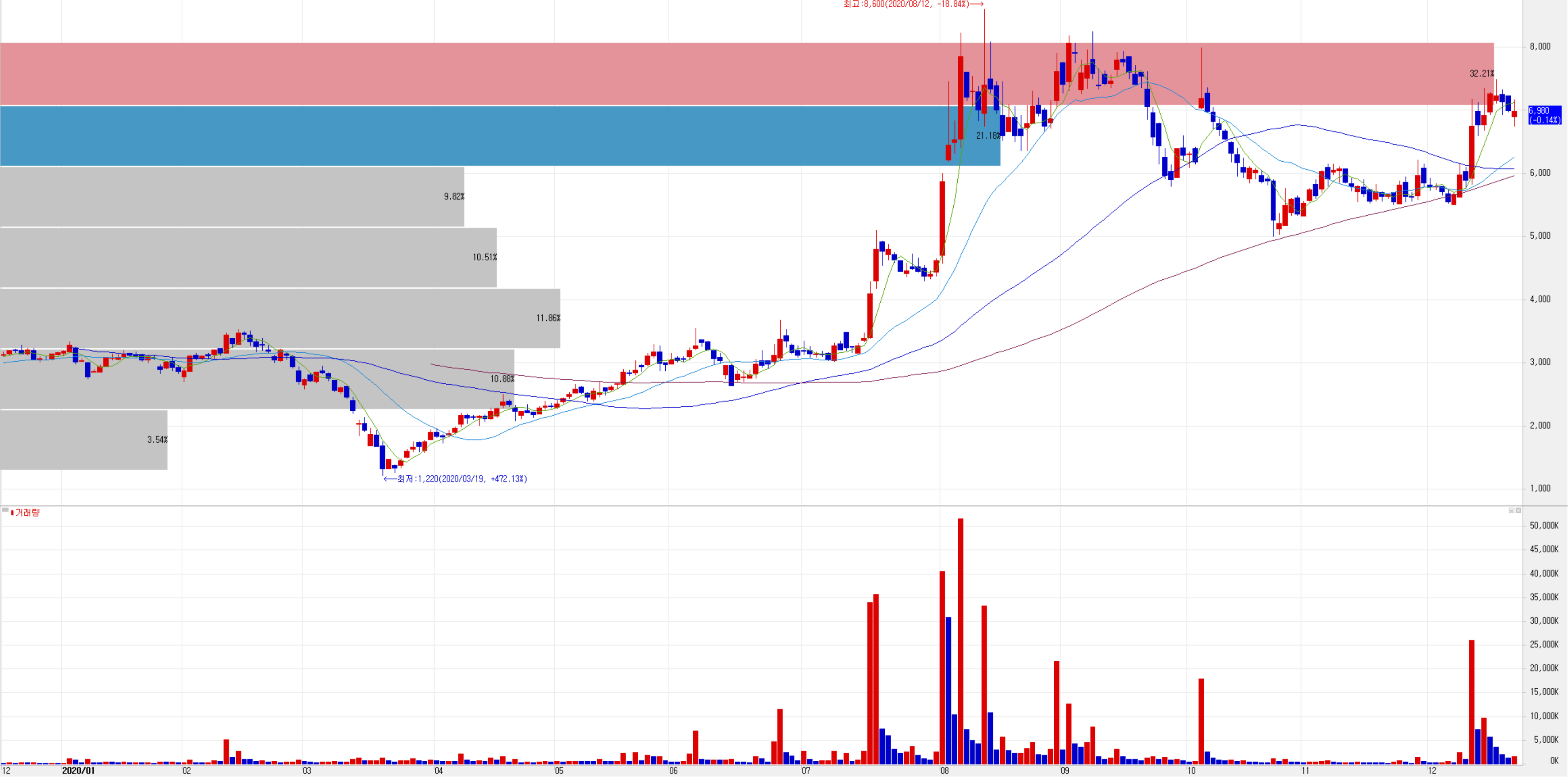 지난 여름 2차전지 종목의 테마 상승과 함께 켐트로스도 3배 가까운 중가 상승이 있었으나 코스닥 중소형주의 조정과 함께 등락을 거듭하는 모습을 보이다가, 12월 초 정부의 탄소제로 전략 발표에 따른 국책과제 주관 기업으로서 다시 급등하는 모습이 보였습니다. 12월 21일 종가 기준 0.14% 하락한 680원에 거래되었는데, 차트상으로는 대기 매물이 많이 쌓여있어서 추가 상승은 시간이 좀 필요할 것 같습니다.