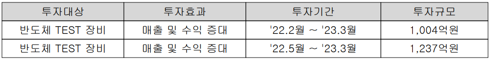 당사는 반도체 테스트 설비 증설을 위해 약 2,240억 원 규모의 투자를 진행했습니다. 또한 지난 2022년 4월 두산그룹 계열사로 편입되면서 향후 5년간 1조 원 규모의 투자를 단행한다고 밝혔습니다.