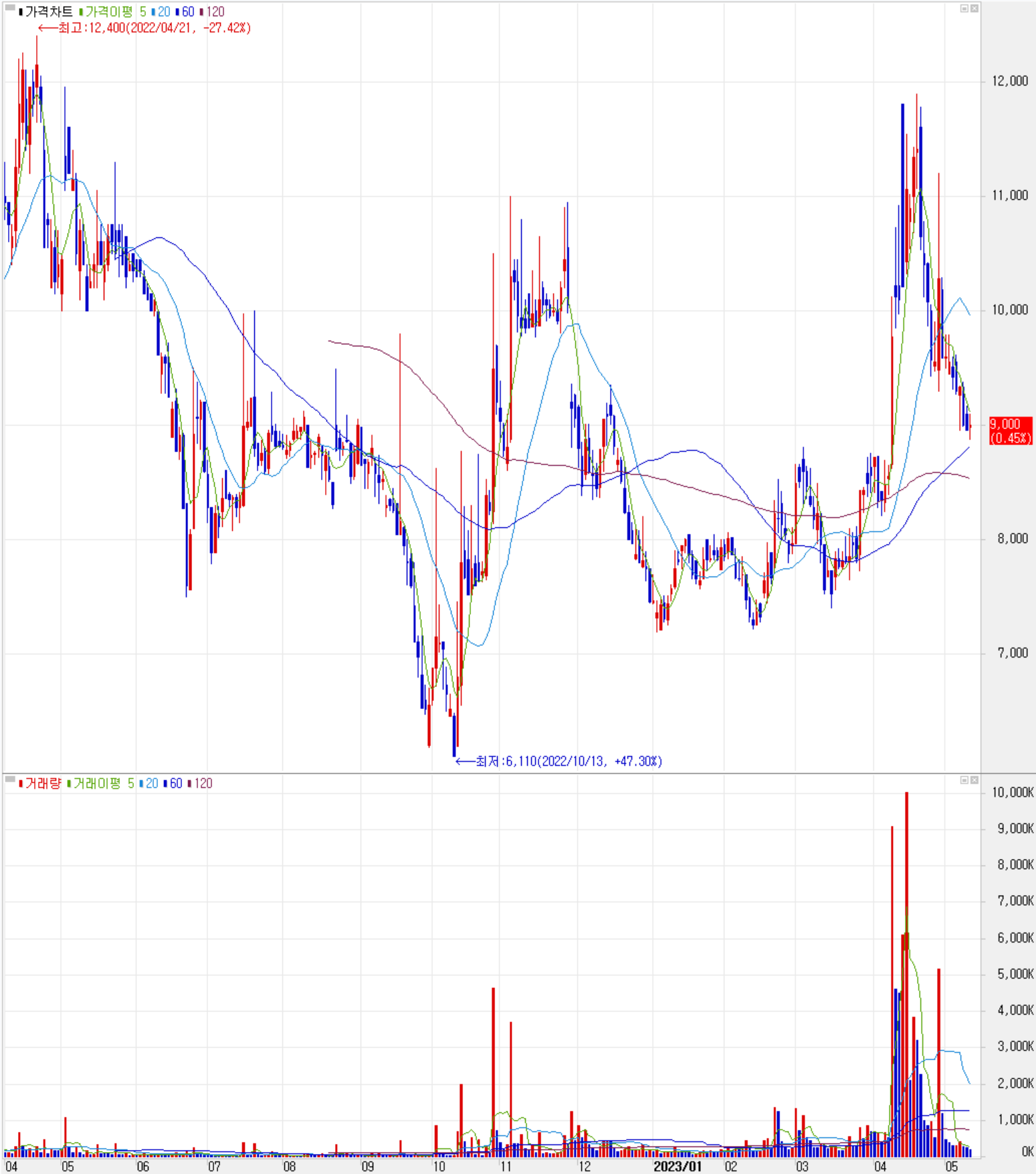 5월 12일 장 종료 기준 당사의 주가는 전일보다 0.45% 오른 9,000원에 거래를 마쳤습니다. 외국인 비중은 0.9%이며, 시가총액 3,911억 원으로 코스닥 시총 기준 174위 종목입니다.