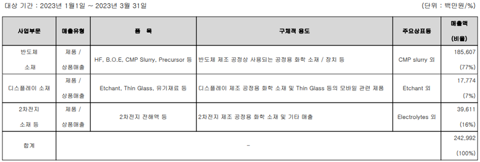 당사는 반도체 및 디스플레이 제조 공정용 화학재료, 2차 전지 소재 등을 생산하고 있습니다. 현재 삼성디스플레이, SK하이닉스, LG디스플레이 등 국내 반도체 및 디스플레이 제조사에 공정용 화학 재료 등을 꾸준히 공급하고 있으며, 2차 전지의 경우 삼성SDI, SK이노베이션, LG화학 등의 국내 2차 전지 제조사에 관련 제품을 공급하고 있습니다.