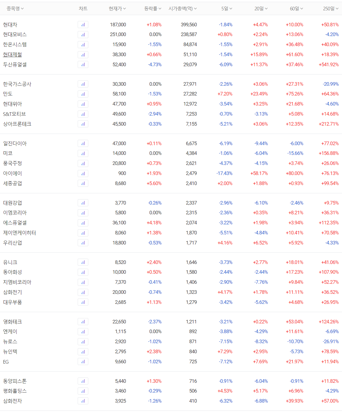 수소차(수소 연료 전지) 관련주 대장주 주간 시황