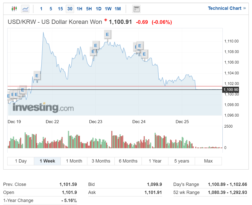 12월 들어 1000원대를 기록하던 원달러 환율은 지난주 1100원대를 회복하면서 1100.91을 기록 중입니다.