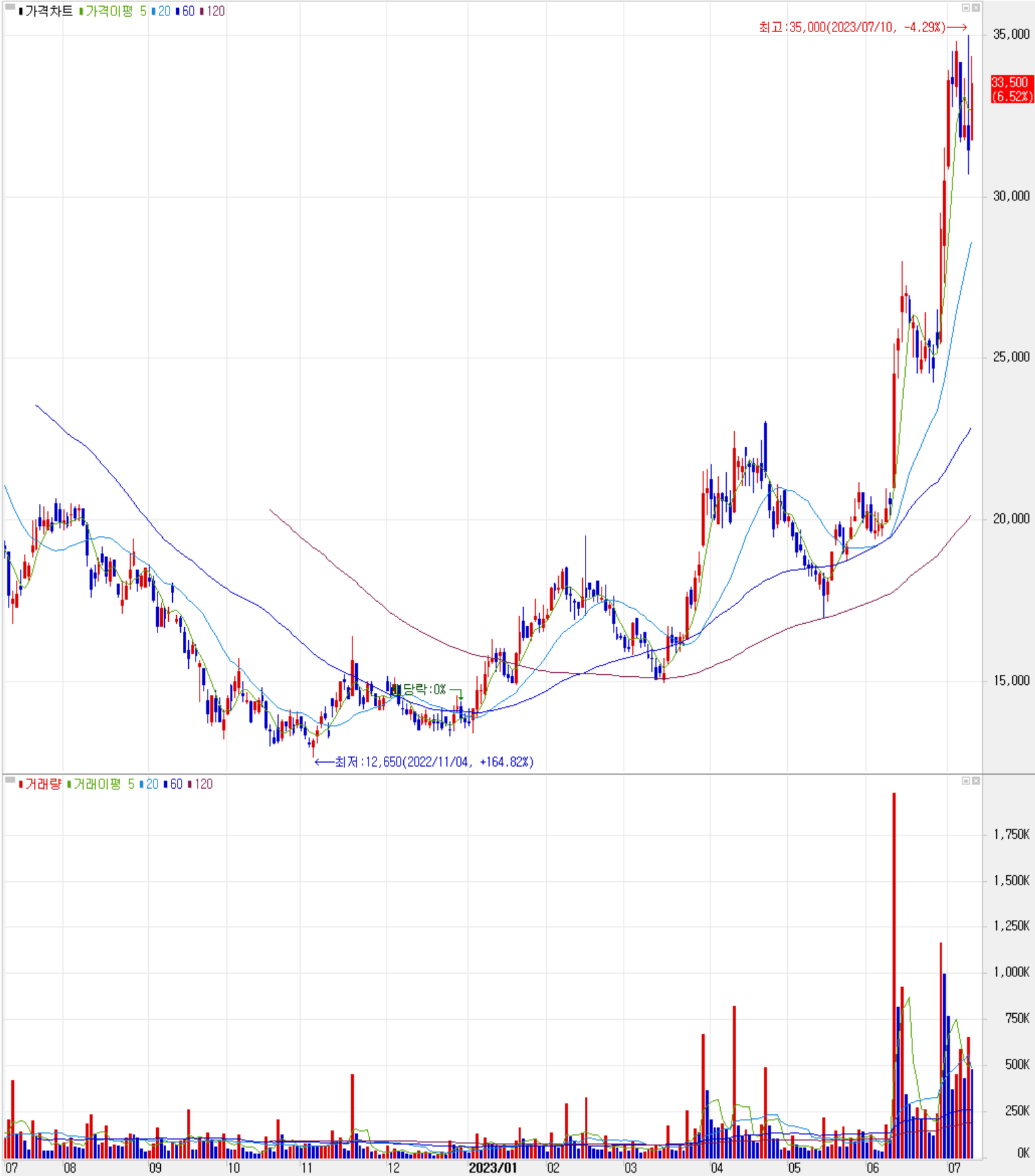 7월 11일 장 종료 기준 당사의 주가는 전일보다 6.52% 오른 33,500원에 거래를 마감했습니다. 외국인 비중은 2.18%이며, 시가총액 4,281억 원으로 코스닥 시총 기준 166위 종목입니다.