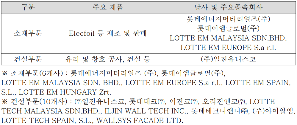 당사의 사업부문은 크게 리튬이온 이차전지 소재인 Elecfoil 등을 생산, 판매하는 소재 부문과 유리 및 창호 공사, 건설공사 등을 주요 사업으로 하는 건설부문으로 구성되어 있습니다. 소재 부문에서는 다양한 IT 기기의 경박단소화 추세에 따라 초극박 일렉포일의 국산화에 성공하면서 수입 대체효과를 달성하였습니다. 해외에는 말레이시아와 유럽 시장을 위한 룩셈부르크 소재 생산 법인을 운영하고 있습니다. 건설부문은 종속회사인 (주)일진유니스코를 통해 건축물 외장 공사를 전문으로 하고 있으며, 건축물에 대한 설계, 시공 및 창호를 제조하고 있습니다.