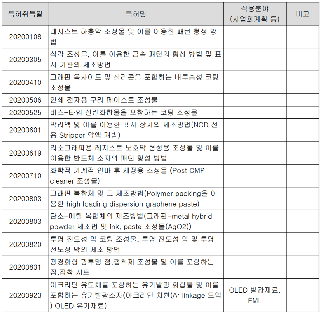 유기절연막, LCD용 PR, LCD PR용 Stripper 등을 국내 최초로 개발하였으며, 4_mask PR 및 인셀터치용 배면전극재료를 세계 최초로 양산에 성공했습니다.
