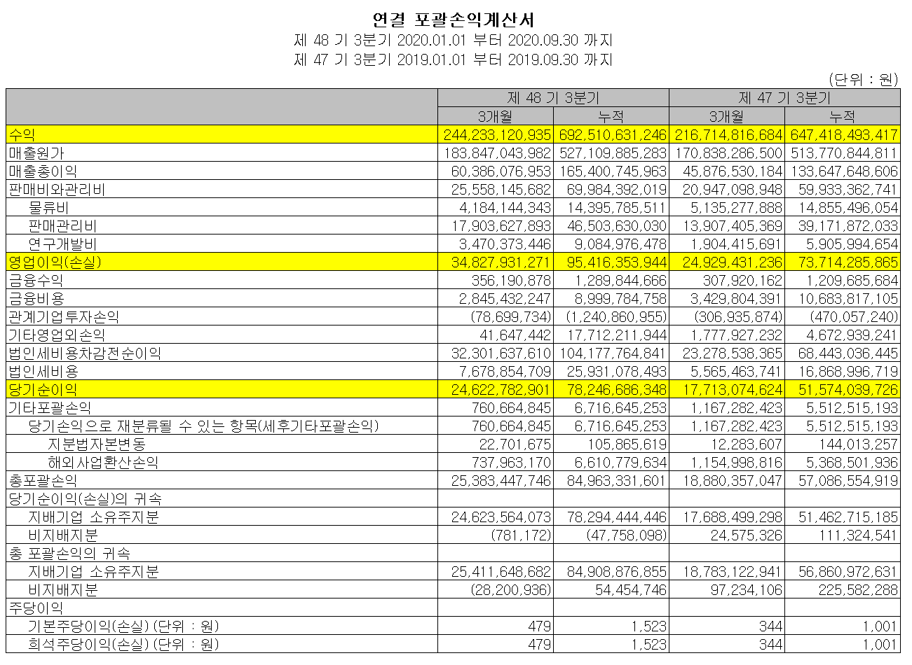3분기 매출액은 2442.3억 원, 영업이익은 348.2억 원으로 전년 동기 대비 각각 12.6%, 39.7% 증가했습니다.